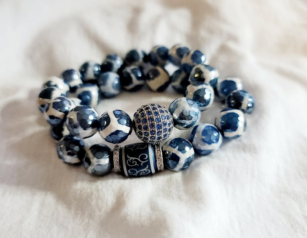 DZI Mystic Blue Electroplated Agate Bracelets Set with CZ Focal Bead 12mm Beads